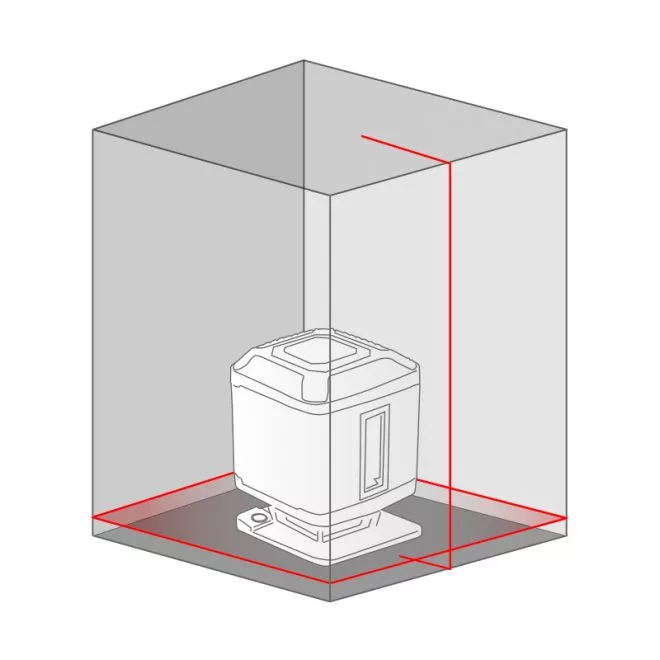 - Niveau laser vert (Réf. 61430). Projette: un plan de 360° à l’horizontale et un plan vertical à 90° par rapport à l’autre formant une croix murales