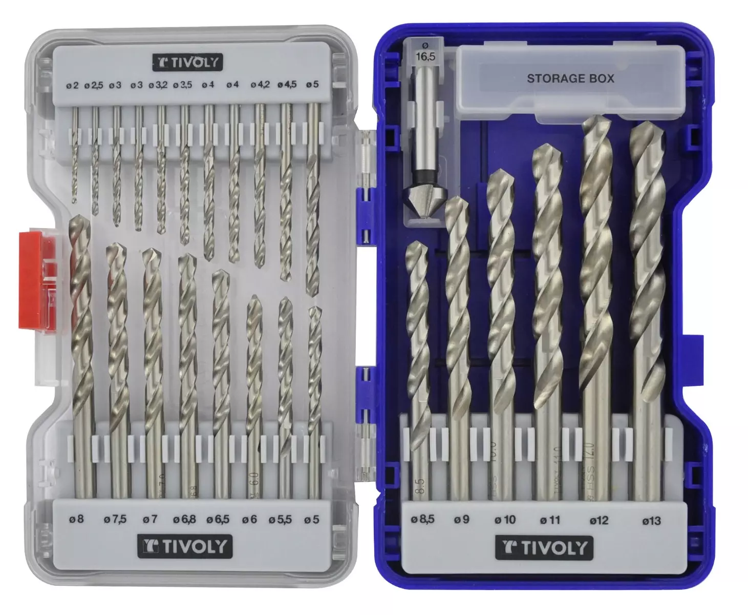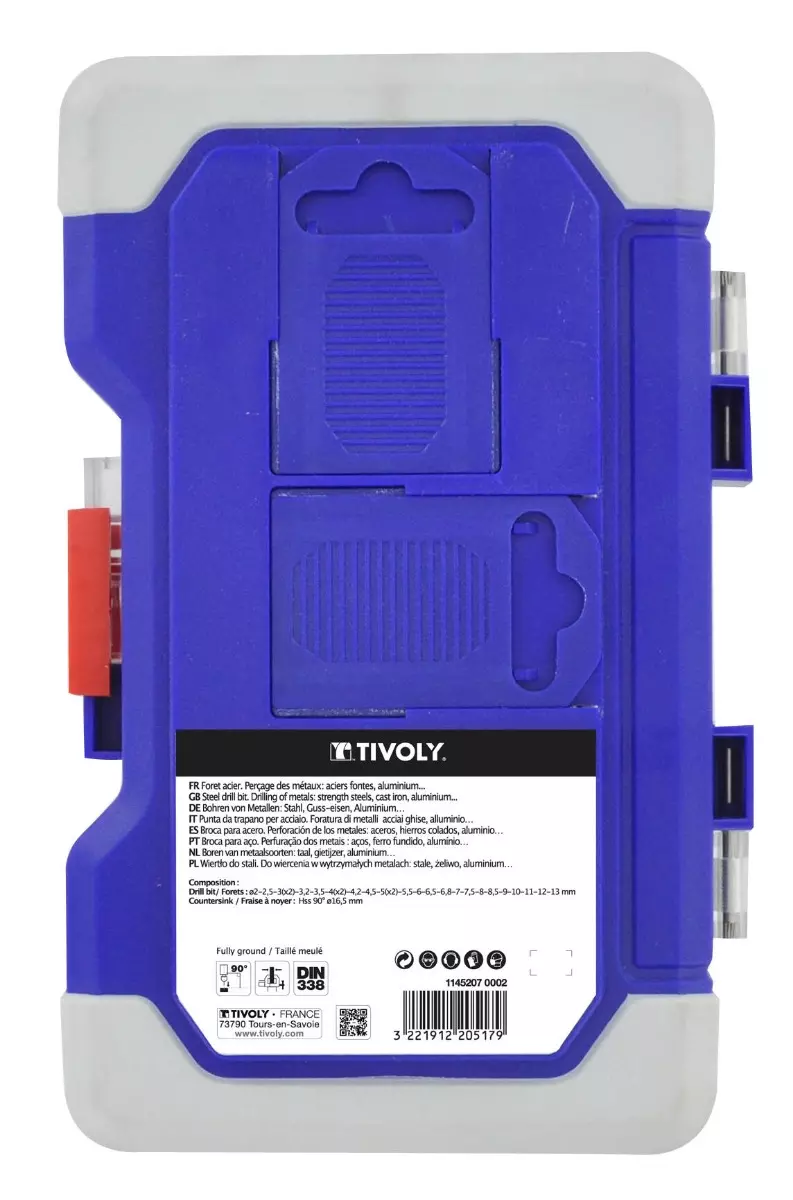 25 forets métaux Ø 2- 2,5- 3- 3- 3,3- 3,5- 4- 4- 4,2- 4,5- 5- 5- 5,5- 6- 6,5- 6,8- 7- 7,5- 8- 8,5- 9- 10- 11- 12- 13mm + 1 fraise à noyer Ø 16,5mm -Coffret RANGER. Coffret de chantier en matière 100% recyclable. Renforts périphériques antichoc. Composition optimisée comprenant les dimensions d’outils les plus utilisés. Boite de rangement intérieure supplémentaire. Particulièrement solide et adapté à un usage nomade.