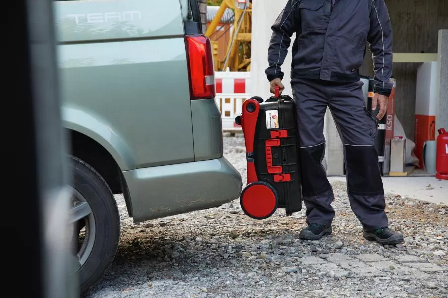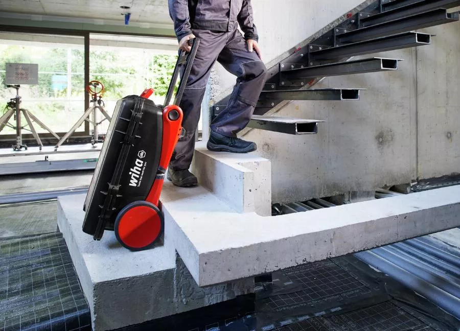 - Grâce à ses roues extra larges, il est facile de tirer le coffret derrière vous sur un terrain difficilement praticable ou sur des marches. Grâce à ses pieds rabattables, le coffret sert également de marchepied antidérapant.