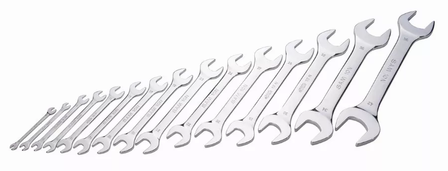 Jeu de 15 clés à fourche forgées en acier au chrome vanadium.