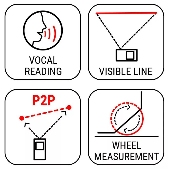 - Roue de mesure intégrée : Faites tourner la roue pour détecter la mesure instantanée. Indispensable pour les mesures latérales sans butée.