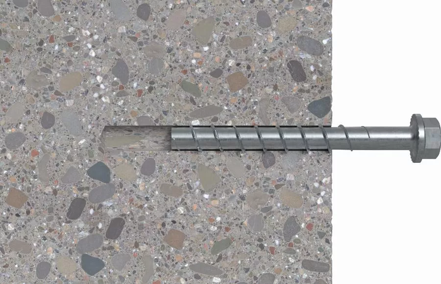 - Lorsque la vis à béton est vissée dans le trou de forage à l’aide d’un tournevis à percussion, les flancs filetés s’enfoncent profondément dans le béton, assurant ainsi une capacité portante supérieure.